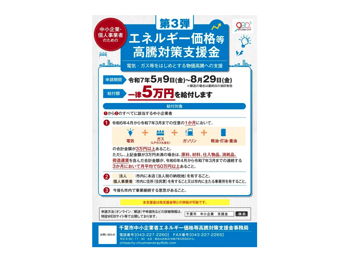 エネルギー価格をはじめとする物価高騰の影響が続く中小企業者の事業継続を支援するため、市独自の支援金として、令和6年4月から令和7年3月までを対象とした「千葉市中小企業者エネルギー価格等高騰対策支援金(第3弾)」を実施します。